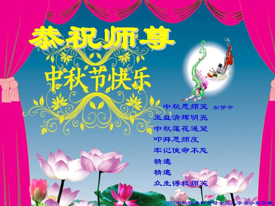 黑龍江省佳木斯母女三人學法小組弟子恭祝慈悲偉大的師尊中秋節快樂!