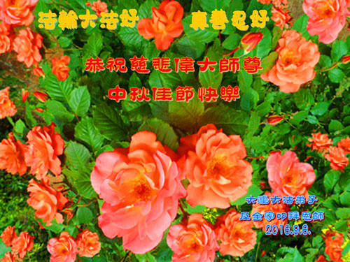 慈悲偉大的師尊您好!一年一度的傳統佳節中秋來臨了。在這花好月圓的節日到來之際,弟子非常想念恩師,感恩師尊多年來的慈悲護佑!多年來在師尊的護佑下,弟子及家人身體越來越健康,生活和工作上沒有後顧之憂,遇到甚麼問題都在不知不覺中被師尊化解。我們遵循師尊的教導做人,一切都在無以言表的玄妙之中進行著,一切都是師尊在做。雖然這裏還很邪惡,但是,我們越來越感受到修煉法輪大法的美好,我們體會到了「一人煉功全家受益」的真實不虛。今後我們還要更好的修煉大法,按照師尊的教導提高自己的心性,修好自己、講真相救人,回報師尊的救度之恩。謝謝師尊!叩拜恩師!