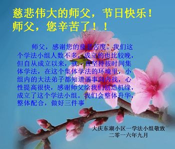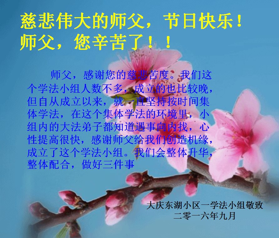 我們能成為師尊的弟子,那是宇宙中至高無上的榮耀!在2016年中秋節來臨之際,我們大慶四位大法弟子及其親屬恭祝慈悲偉大的師尊中秋節好!