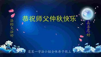 一年一度的中秋佳節又到了,我們學法小組全體大法弟子恭祝師尊節日快樂!感恩師尊為我們大法弟子、為無量眾生巨大的承受和付出!我們無以回報,唯有聽師尊的話做好三件事,修好自己,讓師尊多一份欣慰,少一份操勞!在師尊用巨大的付出延長的寶貴時間裏,用實際行動向師尊交上一份滿意的答卷!