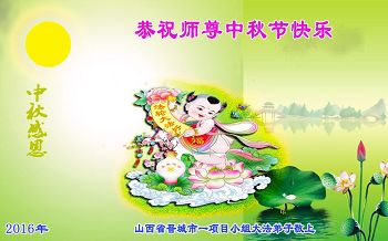 在中秋節到來之際,我們晉城一項目小組大法弟子向師尊致以節日的問候,恭祝慈悲偉大的師尊中秋節快樂!