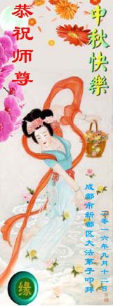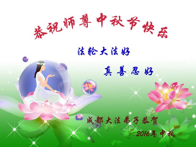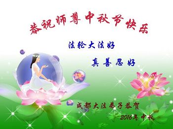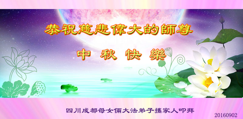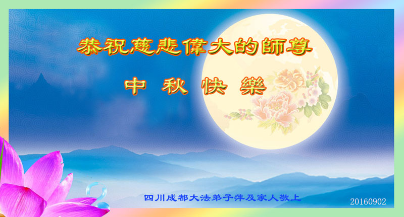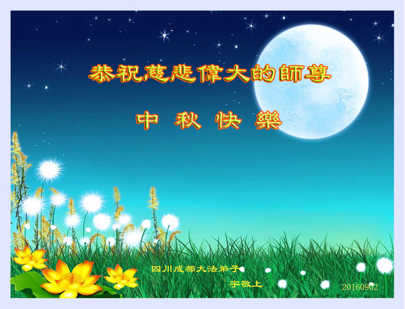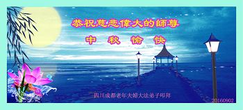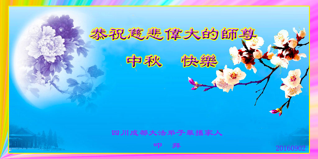 師父您辛苦了,為了大法弟子的圓滿和眾生的得救師父操盡了心。弟子借中秋佳節之際向師尊表達對師尊的感恩之情。在正法最後時刻弟子突然感到成熟了許多,在學法時好像感覺到了法中的內涵,明白了人生的意義,這都是師尊您慈悲苦度的結果。感恩師尊!師尊說過:「正法洪勢過 方知無限妙」(《洪吟二》〈大法好〉),現在的正法形勢讓大法弟子們和眾生有了信心,請師尊放心,弟子一定用心做好三件事並真正用大法歸正自己,救度眾生,讓師尊多一份欣慰,少一份操勞。弟子們等待法正人間的大好時光的到來。