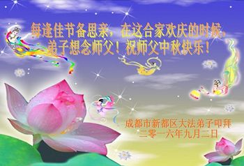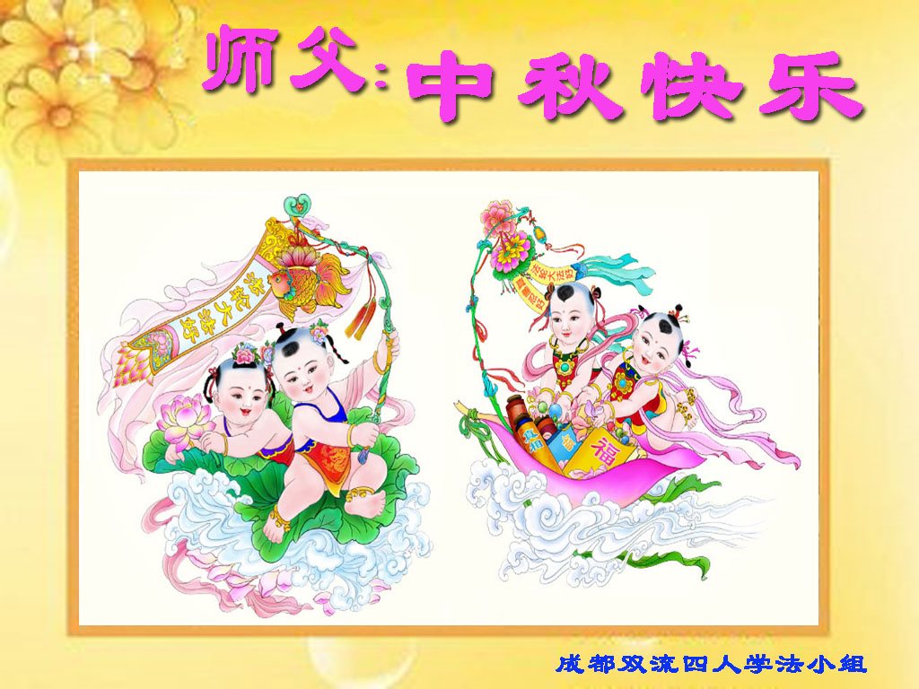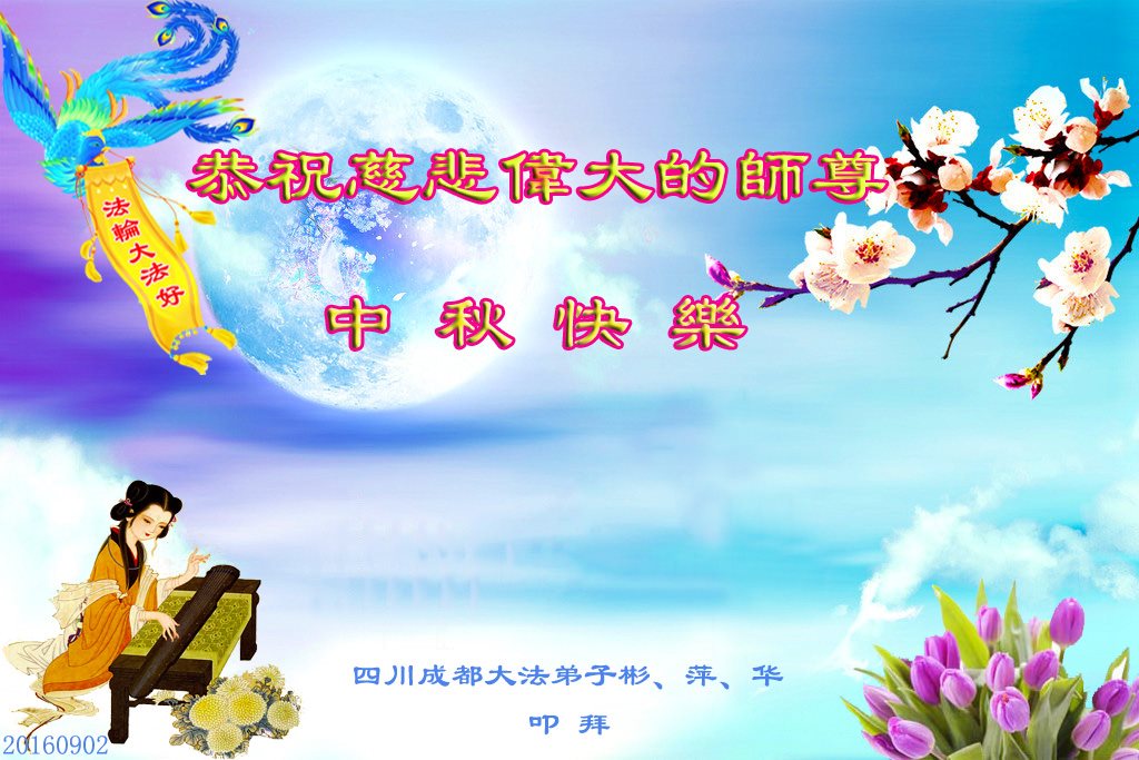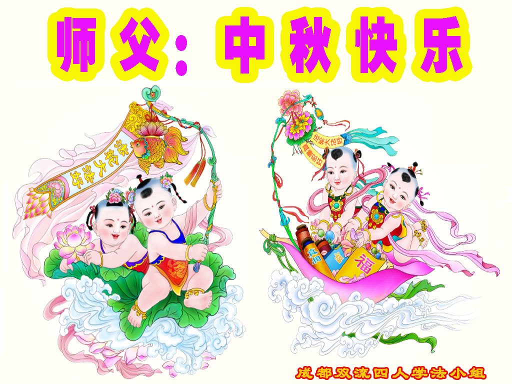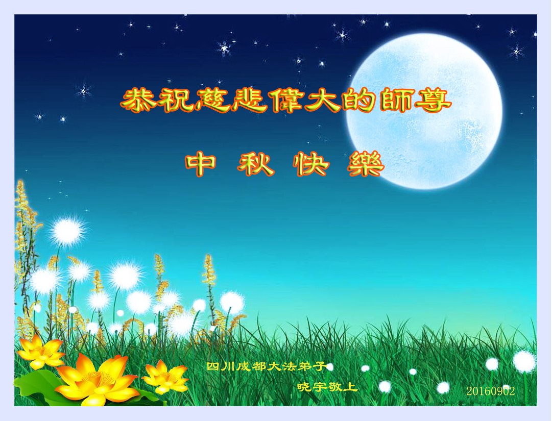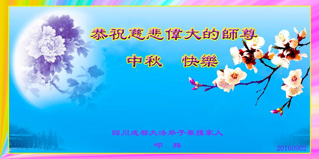 我們是四川成都溫江地區的一個學法小組,值此中秋佳節來臨之際,恭祝師父節日快樂!雖然我們沒有親眼見過師父,但知道師父時時刻刻就在我們身邊呵護這我們,我們大法弟子一定做好三件事,救度更多的眾生,圓滿隨師還。20160907