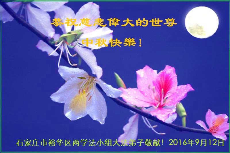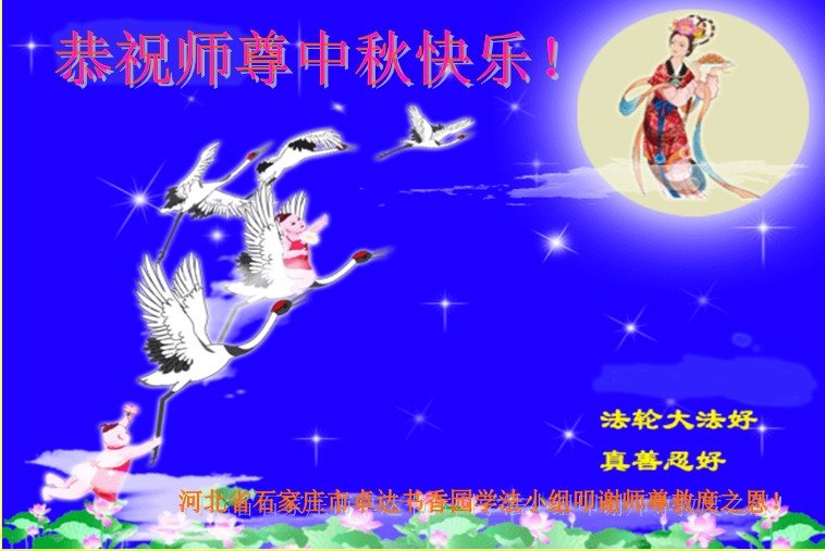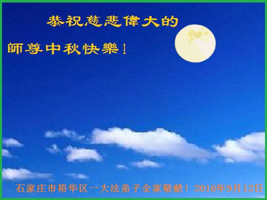 在中秋節到來之際,我們全家祝師尊節日快樂!「真善忍好!法輪大法好!」都深深鐫刻在全家每個人心中。不論從身體上還是從心性上,都深受裨益,全家人和睦相處,其樂融融!而且都很樂於助人,與街坊鄰里關係和諧,真正體現出了佛光普照的幸福和溫馨!