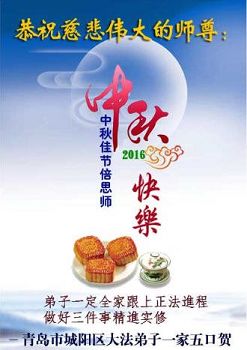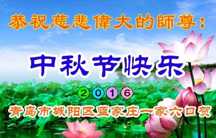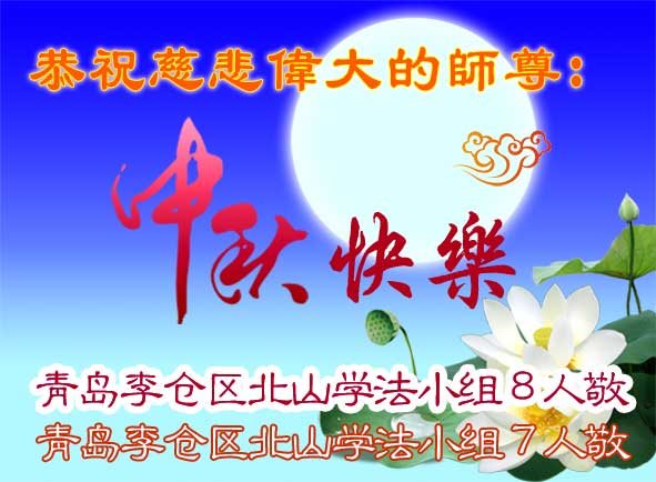 師父好:祝師父中秋節快樂!師父辛苦了,弟子非常想念師父,我們是山東省青島市膠州市學法小組及家人,祝師父中秋節快樂!我們一定做好三件事,勇猛精進,精進,精進,再精進,圓滿隨師把家還。