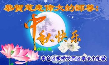 中秋節到了,我們學法小組及家鄉的同修,向慈悲偉大的師父問好。祝師父中秋節快樂!是師父讓我們明白了做人的真正意義,走上了返本歸真的修煉路。在師父的呵護下,我們闖過了巨關巨難。請師父放心,我們決心在師父延續來的時間裏精進、精進、再精進,努力救度更多的眾生。