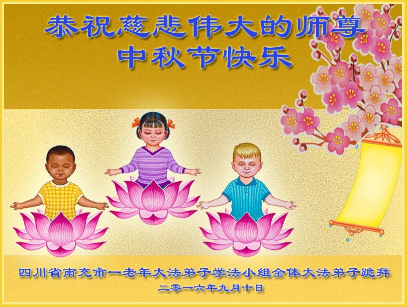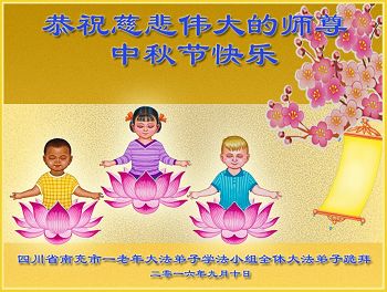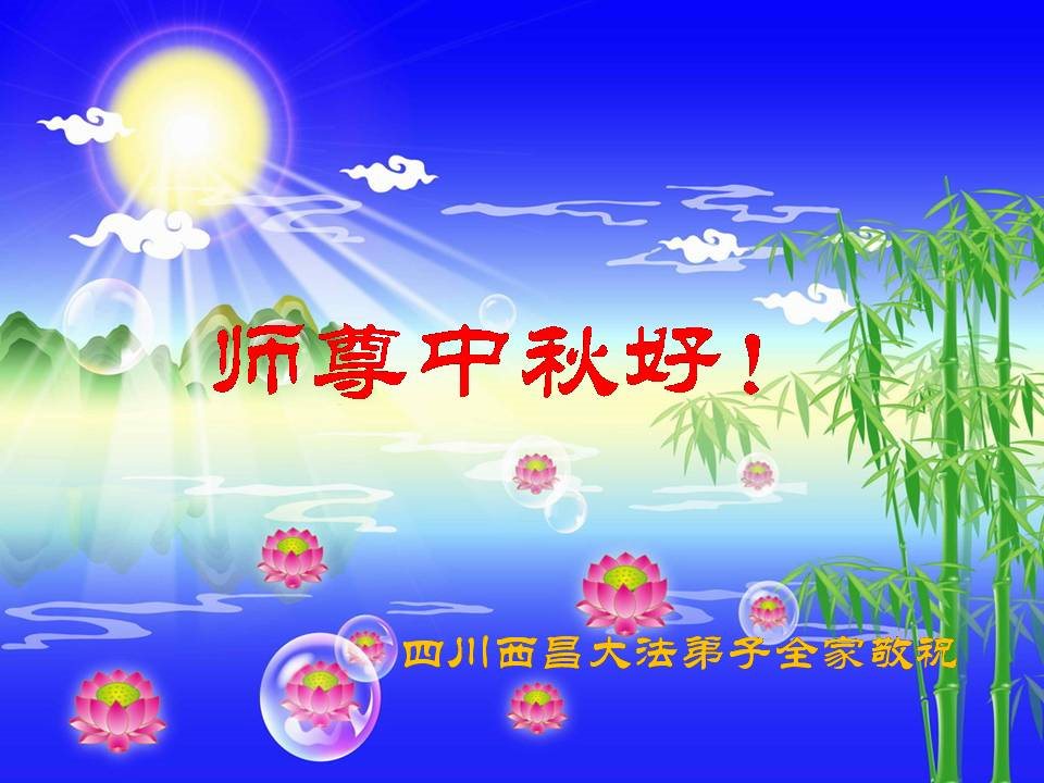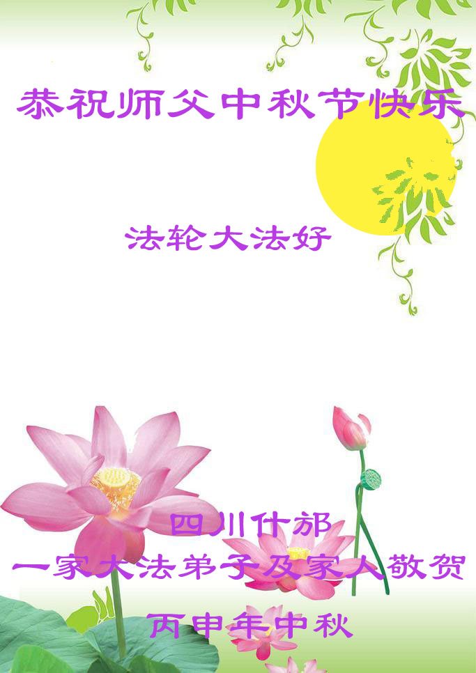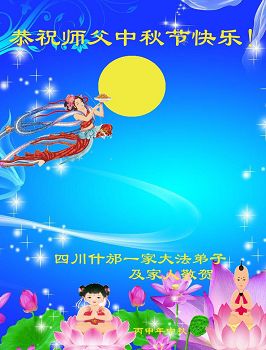 恭祝慈悲偉大的師父中秋節快樂!師父您好!師父辛苦了!弟子們以法為師,修好自己,做好師父囑咐的三件事,救更多的人,謝謝師父的呵護!弟子們全家叩拜師父!四川省什邡市一家大法弟子及家人敬賀!