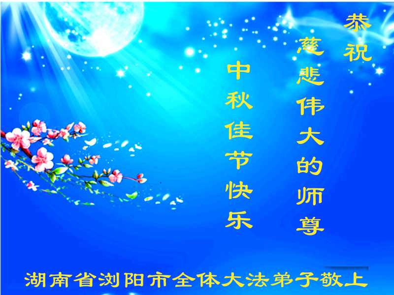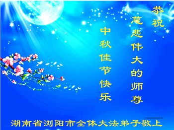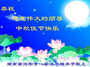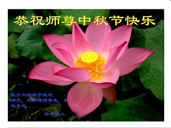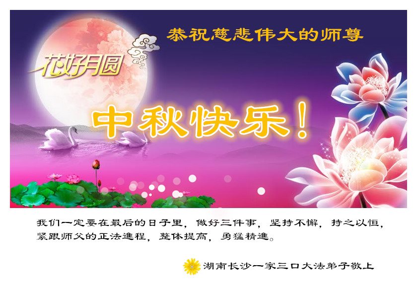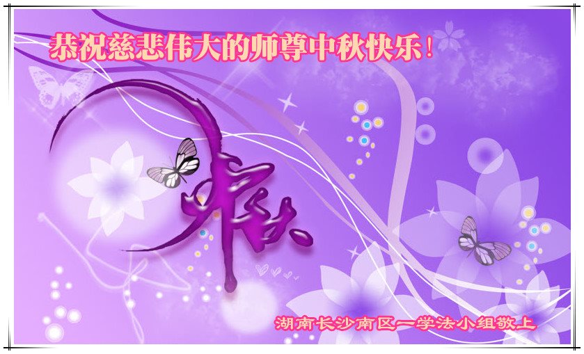 尊敬的師父: 您好! 您辛苦了!正當中秋佳節來臨之際,我們長沙市兩個學法小組──十五個大法弟子懷著無比感恩的心:恭祝師父中秋節快樂!師父好!在十多年邪惡的殘酷迫害中,是您在艱難的歲月裏,歷盡千辛萬苦為我們在修煉的路上導航;是您為我們承受了巨難,時刻看護,點悟,鼓勵我們,使我們在救度眾生的路上,互相配合,共同精進,完成使命!想起您:我們淚流滿面,千言萬語也表達不了對您的感恩。只有在正法的最後時刻:弟子們一定持之以恆的做好三件事。多學法,多發正念,多救人,不給自己留下遺憾,不辜負師父的殷切期望!