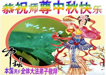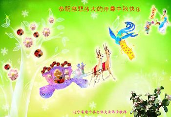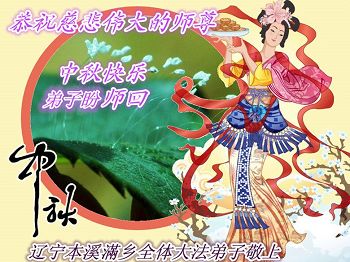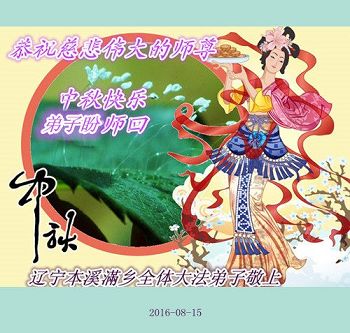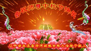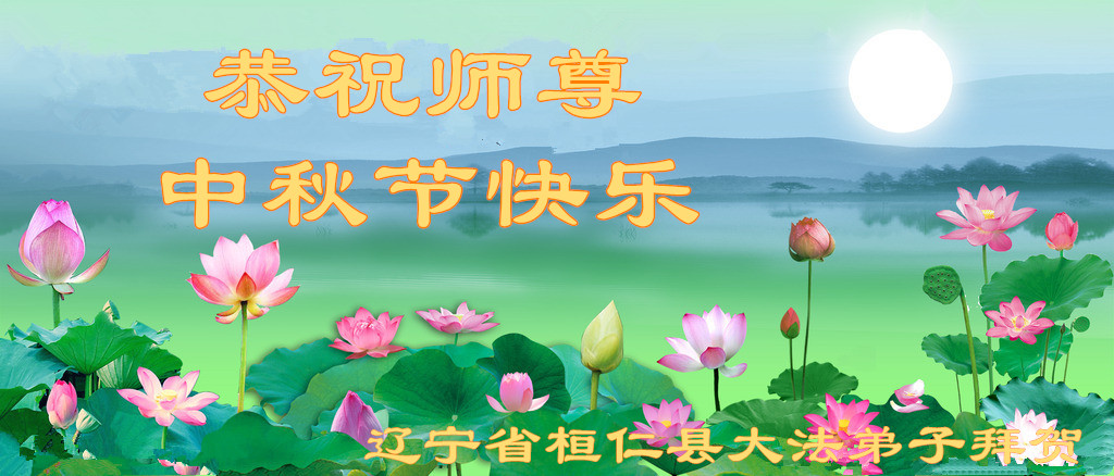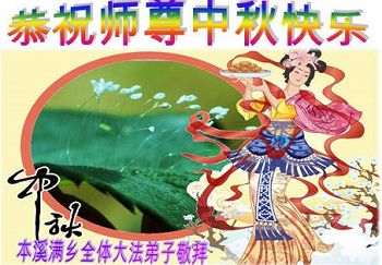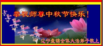 我們是遼寧朝陽大法弟子,我代表我們學法小組及全家恭祝師父中秋節快樂!在今後修煉時間不多的日子裏,我們會加倍努力做好三件,多救人,時刻修好自己,讓師父多一份寬心,少一份擔心,走好師父安排的路,圓滿隨父還。