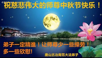 值此中秋佳節來臨之際,河北唐山全體大法弟子恭祝偉大的師尊中秋快樂!弟子們一定精進再精進,做好三件事,圓滿跟師尊回家。謝謝慈悲偉大的師尊!