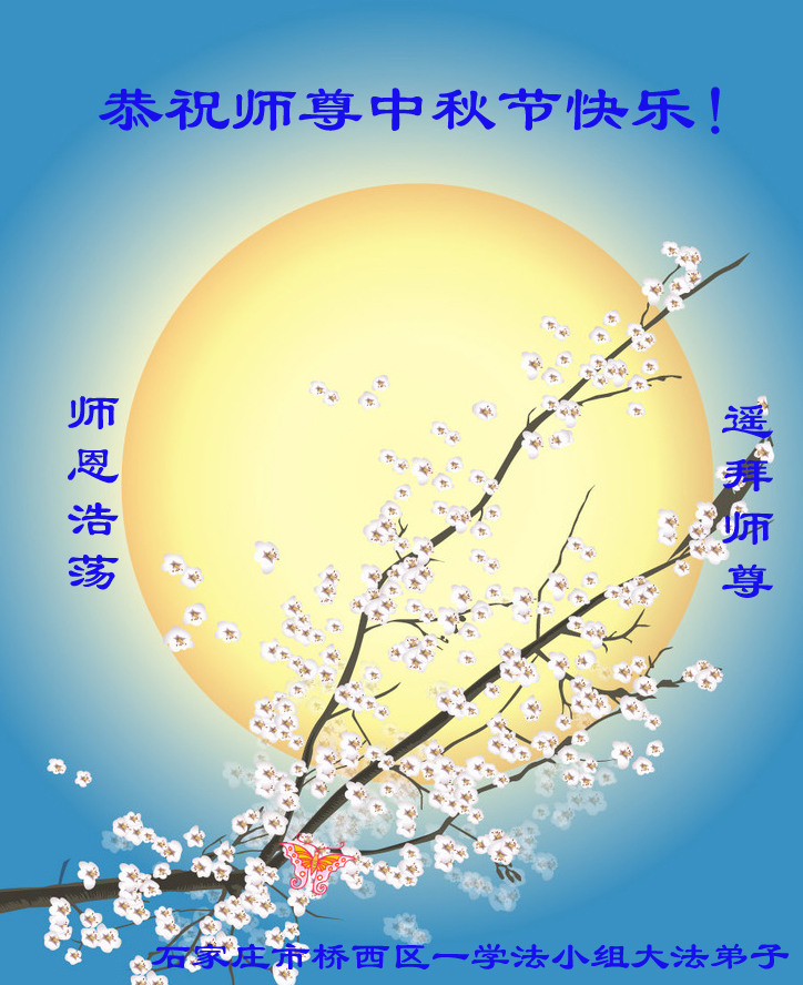 河北石家莊市橋西區大法弟子恭祝師尊中秋節快樂!師恩浩蕩,遙拜師尊,弟子們唯有修好自己,勇猛精進,多救人,回報恩師的慈悲苦度!