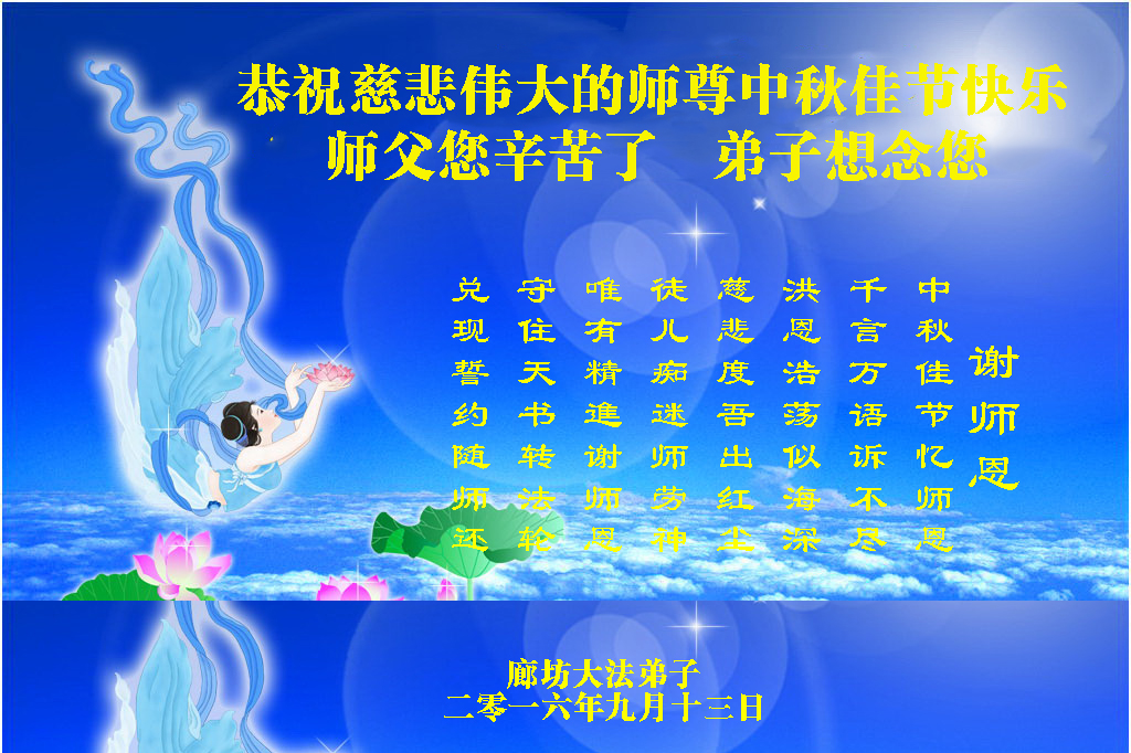 師尊!不覺中又一年中秋佳節來臨了,弟子真是感慨萬千,師尊的法輪大法福澤了滄海桑田、世間萬物、一切眾生;天體還在淨化、人心還在歸正、道德在急速回升;一切眾生無不敬仰和回報師尊和大法之洪恩。