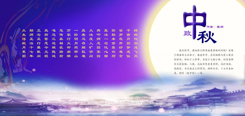 中秋節到來了,法輪大法弟子遙祝洪大慈悲的主佛李洪志恩師中秋節快樂!感謝您無私賜給我大法,使我和眾多明白法理的生命能在大法法理指導和呵護中不斷歸正回升。修煉中懈怠時和磨難中,您慈父般的法理啟迪給徒兒添正念:助師正法中法理開啟徒兒的智慧和勇氣……千言萬語道不盡對恩師的感恩!用全宇宙最美的﹒最好的語言都無法表達我對賜給我新生命的洪大慈悲的主佛李洪志恩師的感恩!