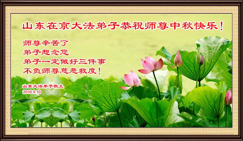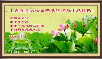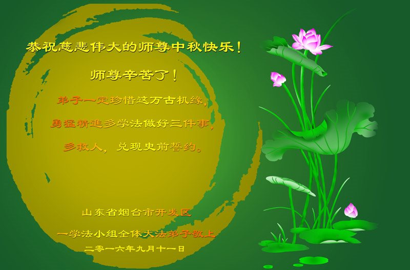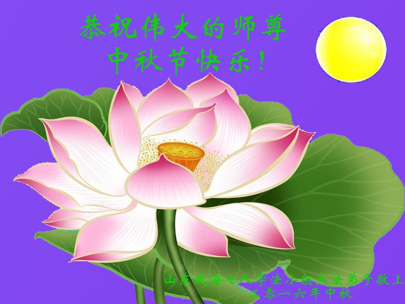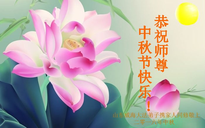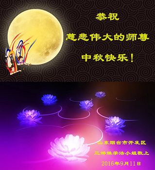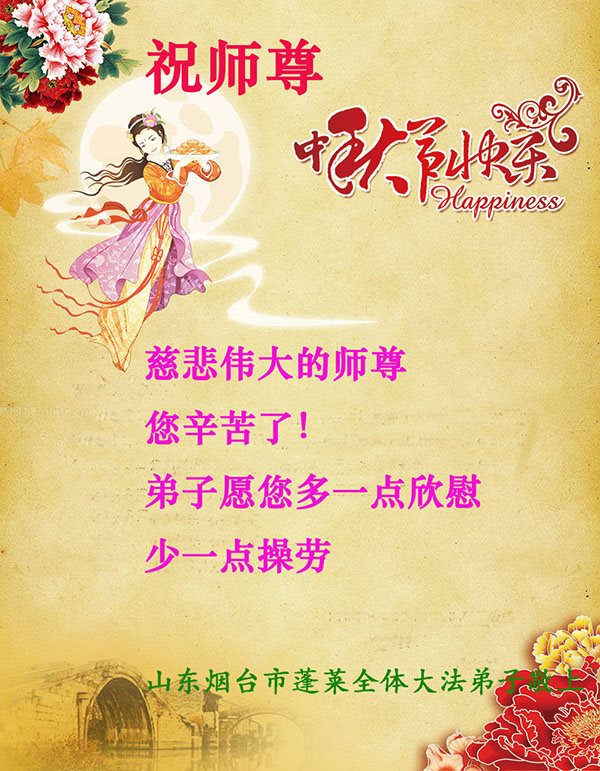 中秋佳節又來到了,弟子們非常想念您!回首弟子們修煉中所走的每一步,都凝聚著慈悲偉大師尊為弟子的承受和無量的心血,弟子們深知現在所剩的時間都是慈悲偉大師尊用巨大承受為弟子修煉與救眾生延續來的,是生命永遠都無法回報的,師尊洪大的慈悲弟子們都能感受的到。僅在中秋佳節來臨之際,借明慧一角:送去弟子們對偉大慈悲師尊的一份無限的感恩和深深的祝願!在今後正法有限的日子裏,弟子們將無比的珍惜師尊為我們延續來的也是亙古不再有的珍貴機緣,要把每一天當作最後一天來珍惜,不受外界形勢的干擾,時刻用大法的標準衡量,不斷的多學法,以法為師,紮實做好大法弟子該做的,兌現誓約;時刻不忘向內找,排除干擾,真正的在法上提高,共同配合,形成強大的整體,努力精進實修,圓容師尊所要的,儘量讓師尊多一份欣慰!少一些操勞!弟子們在此叩拜師尊!再道一聲;慈悲偉大的師尊您辛苦了!弟子們謝謝師尊!合十!