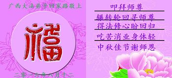 又迎來了一個中秋節,作為弟子的我,不懂用甚麼語言來表達對師尊的感恩!師父又一次給了我生命!在今年五月十九日晚被邪惡追殺的我,在師尊的慈悲呵護下,我已安全脫險。沒有師父的保護,也許我就不能還在中秋佳節與師父團圓了。此時的我禁不住淚流滿面,師父無時無刻不在弟子的身邊呵護!弟子跪謝恩師的慈悲救度!我定會好好珍惜師父給弟子延長來的生命!