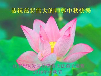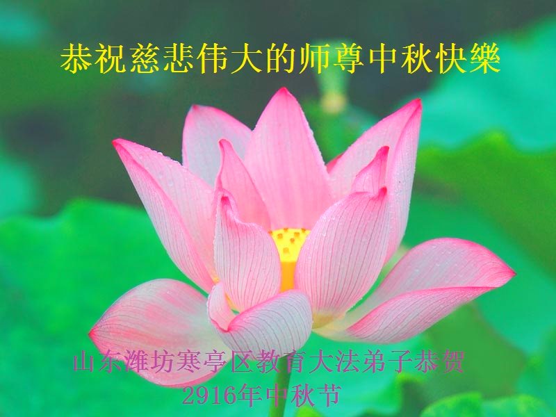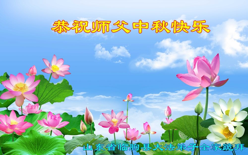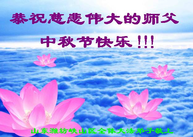 山東濰坊大法弟子向師尊問好,師尊中秋節快樂!中秋節來臨,弟子們想念師父,我們只有把想念化為精進實修的動力才不辜負師尊您的慈悲苦度;我們雖然在修煉中還有很多不足,弟子們會在法中歸正。儘快提高自己,多救人。圓滿隨師還,唯願師尊笑。