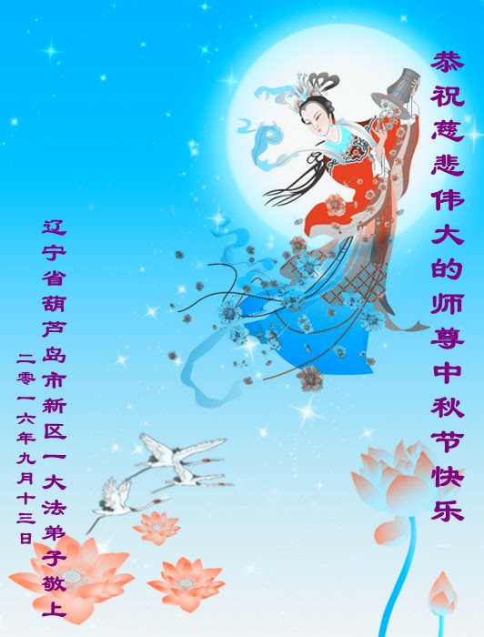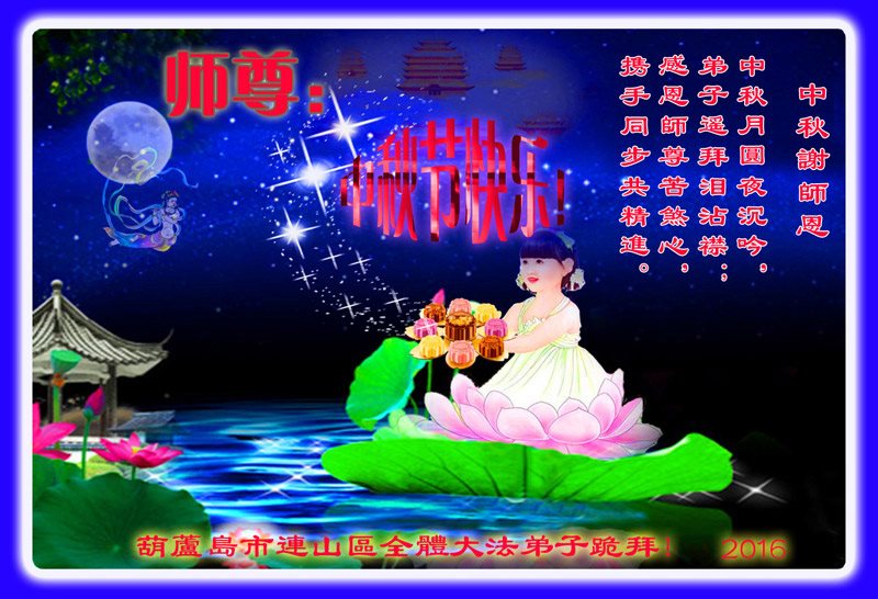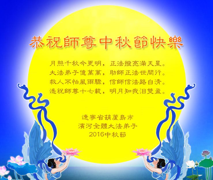 師父好!師父您辛苦了!在中秋節到來之際,濱河全體大法弟子向師尊問好!感謝師父把我們從紅塵中救起,像撥亮星斗一樣,把我們洗淨,賜予我們助師正法的榮耀與使命。請師父放心,濱河全體大法弟子一定會做好,少讓師父操心。在這中秋佳節的時候,我們更加想念師父,為讓師父多一點寬慰,獻小詩一首以表寸心: