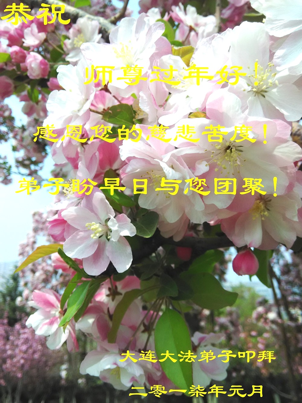 師徒恩,蒼宇深,佳節思聖親!我們非常想念師尊!您用洪大的慈悲頂著巨大的壓力給我們迎來了新的一年,師尊啊!謝謝您!謝謝您!在新的一年裏,我們要更好的做好三件事,學好法,修去執著心,兌現自己的誓約,帶領眾生迎接師尊回中原。再次恭祝師尊新年好!合十叩拜師尊!