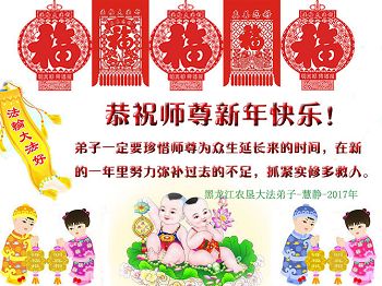 師尊您好!我們大部份都是從新走回來的弟子,在過去的一年裏,我們經歷了許多的魔難和大關,但是在您的慈悲看護下,在您的鼓勵和加持下,我們都走了過來。在此,我們由衷的感謝師尊對我們的慈悲苦度!也更堅定了我們精進修煉的決心,我們現在正在突破人心的干擾,遇事向內找,努力修好自己,從發放真相資料到面對面的送真相小冊子,爭取做到堂堂正正的講真相、勸三退。做好三件事,跟師尊回家!