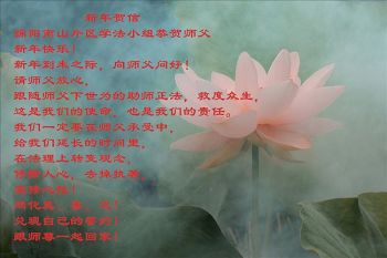 我們學法小組大法弟子給師父拜年!祝師父在新的一年裏少一份操勞,多一份欣慰。弟子會牢記師尊的教誨,多學法,在修好自己的同時,做好三件事,更快更多的救人,不辜負師尊的慈悲苦度。弟子們叩拜師恩!弟子叩拜敬上!