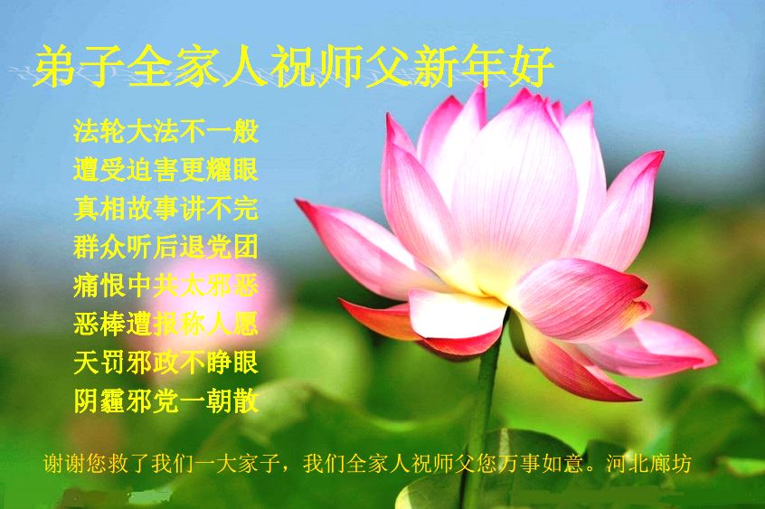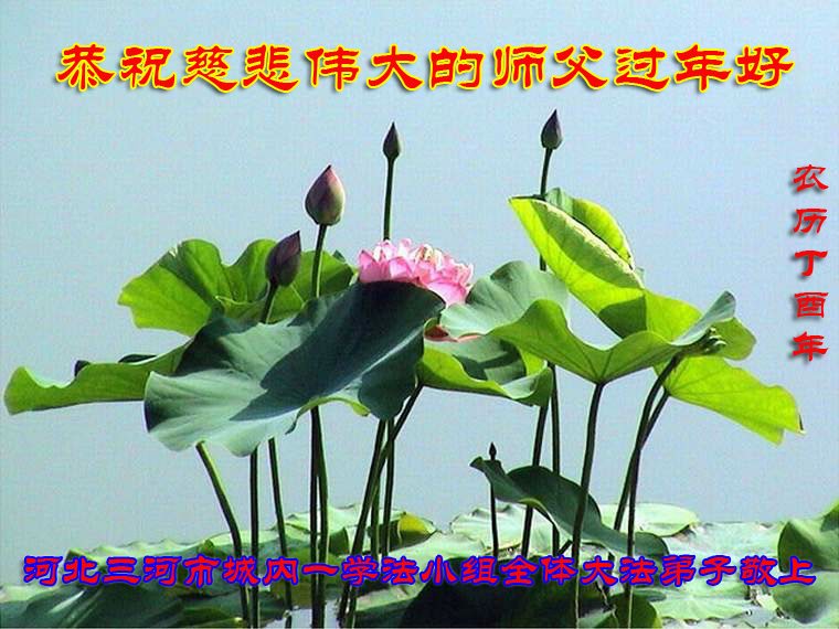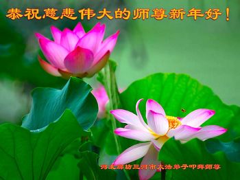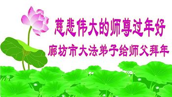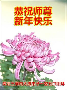 慈悲偉大的師尊:我們夫婦倆給您拜年!在新的一年裏我們一定緊跟師尊,多學法,學好法,向內修,做好三件事,堅定實修,證實大法,勇猛精進直至圓滿!叩拜師尊救度之恩!