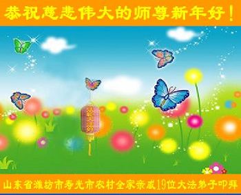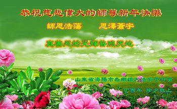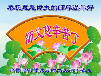 新年快到了,在這新年即將到來之際,我代表我們鄉鎮的全體大法弟子給師尊拜年了,恭祝師尊新年快樂!師尊您辛苦了!弟子們向您跪拜!