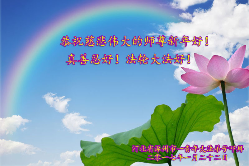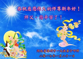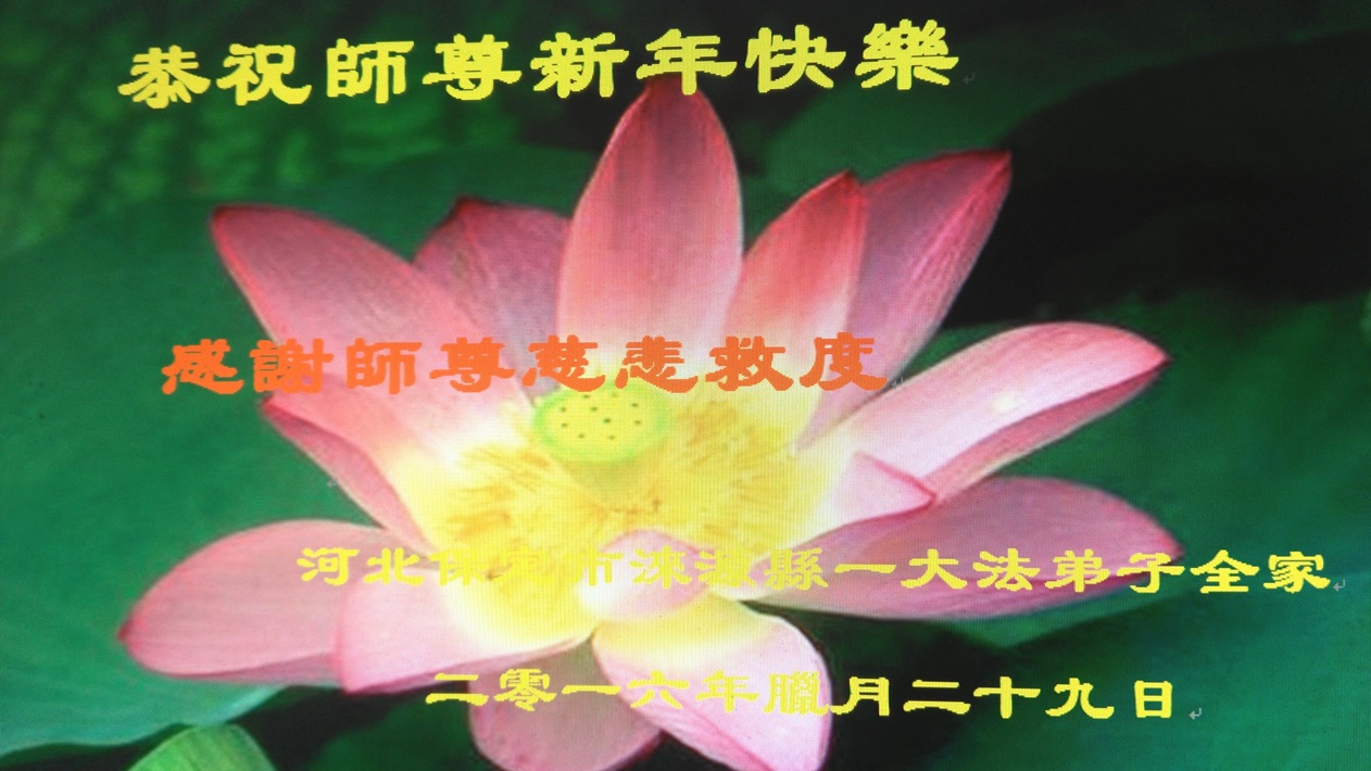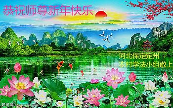 在喜迎丁酉新年之際,我們河北省保定博野縣全體大法弟子懷著無比敬仰感恩的心情給慈悲偉大的師尊拜個年!師父辛苦了!感恩師尊的慈悲苦度!感恩師尊為徒兒們巨大的付出,在此為您送上一份真誠的新年的祝願,遙祝師尊新年快樂!