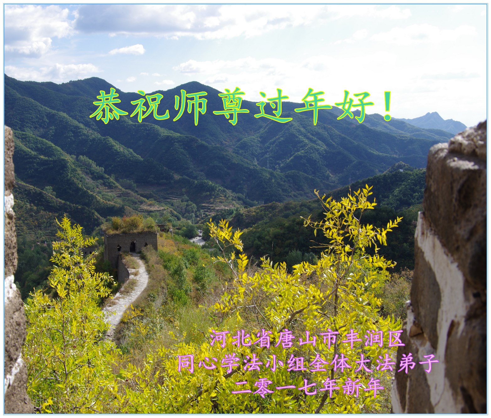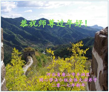 在此新春佳節之際。河北唐山市一學法小組和一資料點的全體大法弟子叩拜師尊。恭祝慈悲偉大的師尊過年好!我們會繼續勇猛精進,做好三件事、學好法、向內找,整體圓容,多救人,願師尊多一份欣慰,少一份操勞。