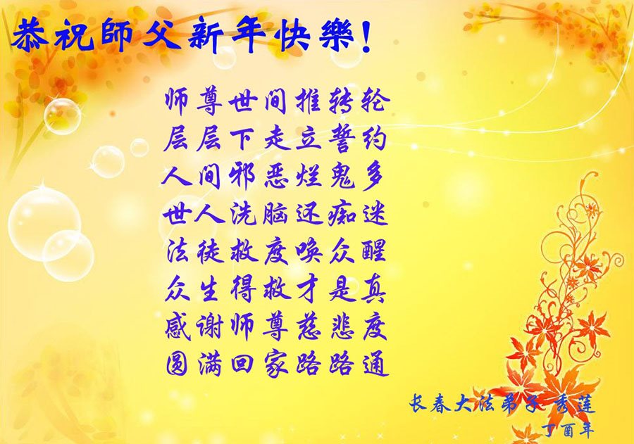 弟子們祝師尊新年快樂!過年好!弟子們非常想念師父!弟子們要按照師父的要求,做好三件事,學法修心向內找,多救人。
