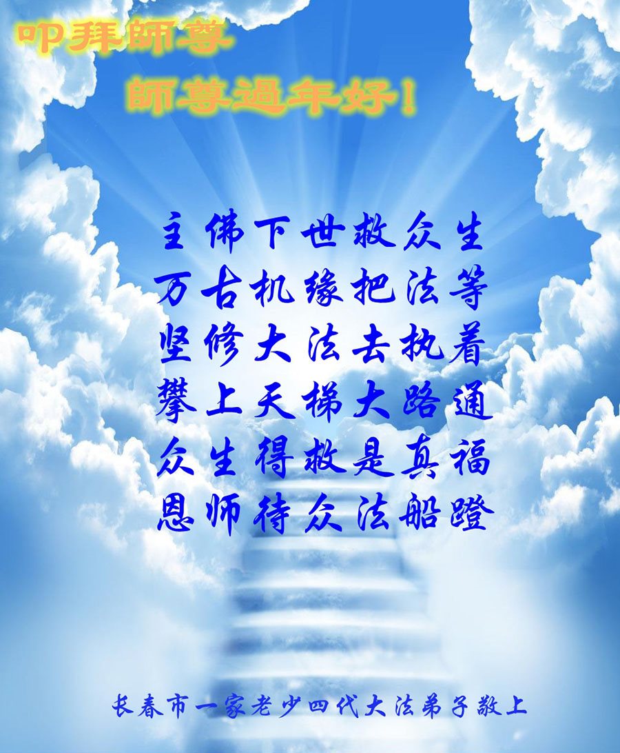 慈悲偉大的師尊:新年好!師尊您辛苦了!弟子們想念師父,千言萬語也無法表達對師尊的感恩。我們是七人學法小組,一定要發揮整體的作用,互相配合,互相幫助,共同精進,多學法,學好法。按法的要求去做,真正的修自己,去人心,有問題、有矛盾向內找,抓緊時間多救人,兌現史前的誓約。一定珍惜這萬古機緣,珍惜這修煉的機會,圓滿隨師還。