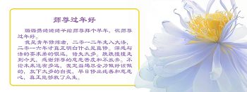 在師父的呵護下弟子走過了二十年,經歷了無數的風風雨雨、坎坎坷坷,在巨難中是師父以巨大的慈悲一次次地把弟子點醒,使弟子始終能在大法中修煉、成長,堅定不移。在以後的修煉中,弟子將努力做好大法弟子的三件事,精進精進再精進,不負師尊所望,兌現史前誓約,跟師父回家。