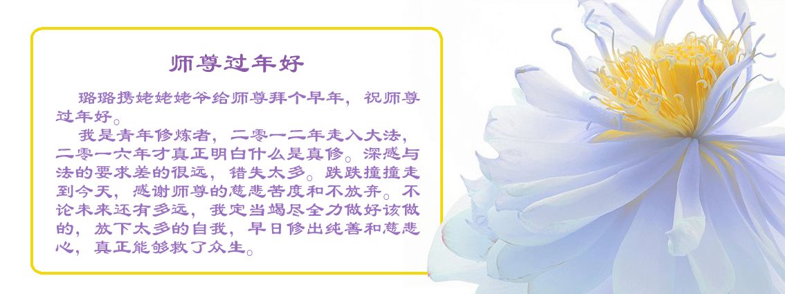 又是一個新年到,在師尊的呵護和法的指導下,弟子修煉的意志更堅,方向更明,謝謝師尊的慈悲苦度,弟子一定會做好該做的事。在此也代表全家感謝師尊的保祐;代表全家恭祝師尊新年快樂!