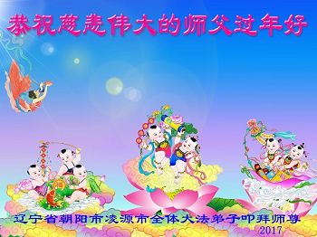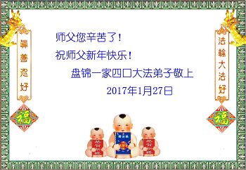 尊敬的師尊:您好!在2017新年到來之際,盤錦全體大法弟子懷著對師父深切的思念向師尊問好!師父您辛苦了!弟子一定聽師尊的教誨,學好法,向內找,修好自己,做好三件事,兌現在天誓約,完成歷史賦予的使命。