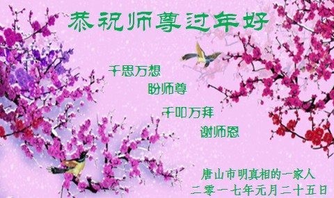 明真相的大法弟子家屬也恭祝師父新年好!新年快樂!盼望大法早日平反,盼望師父早日回歸中國大陸,期盼法正人間的到來,一洗人間污濁,蓮花開遍神州,萬物回春,同沐法光。