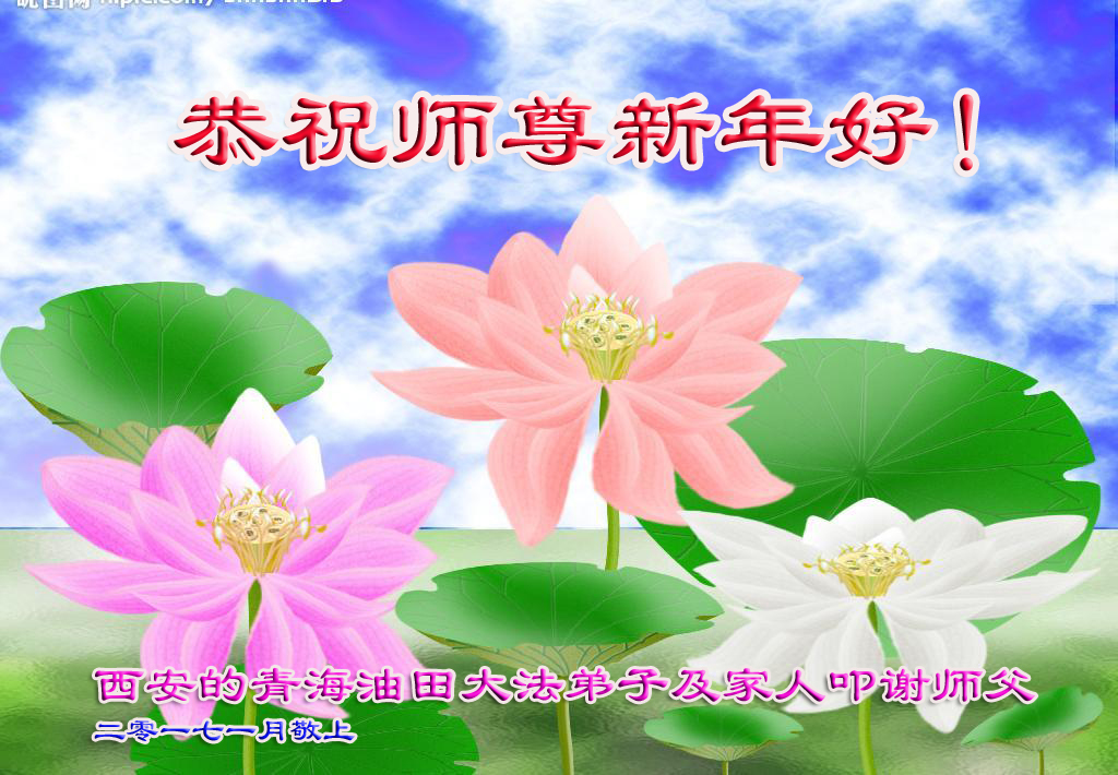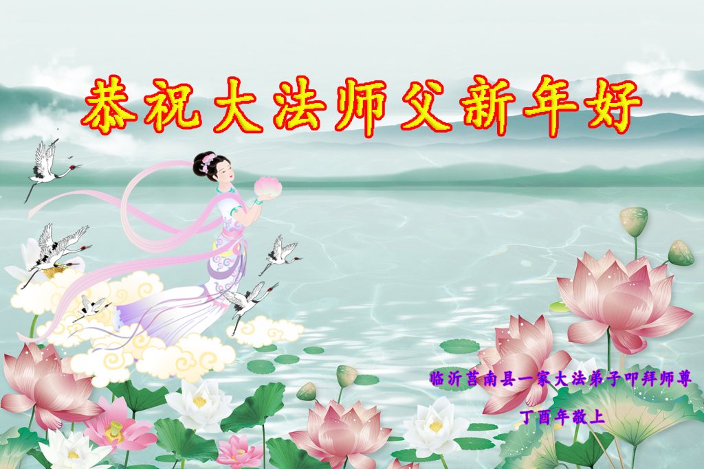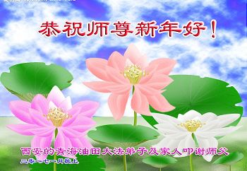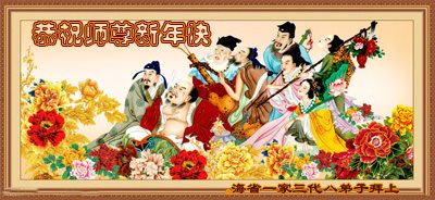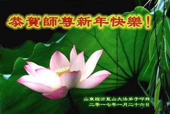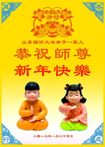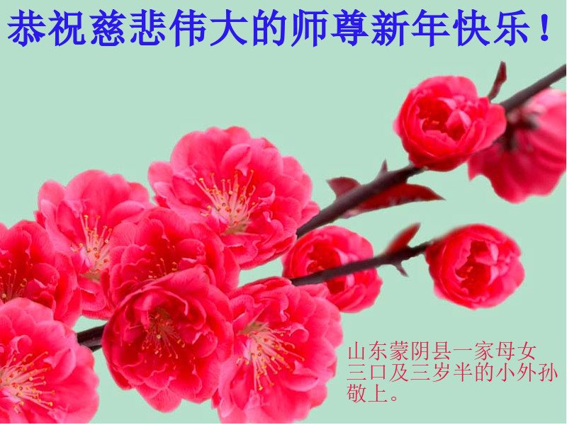 尊敬的師父新年好:弟子一定努力好好學法,修好自己,救度眾生。願師父多一份欣慰,少一份操勞,師父救度眾生辛苦了。弟子代表全家修煉的父母及兒子與倆個小姪女三個小弟子給師父拜年!