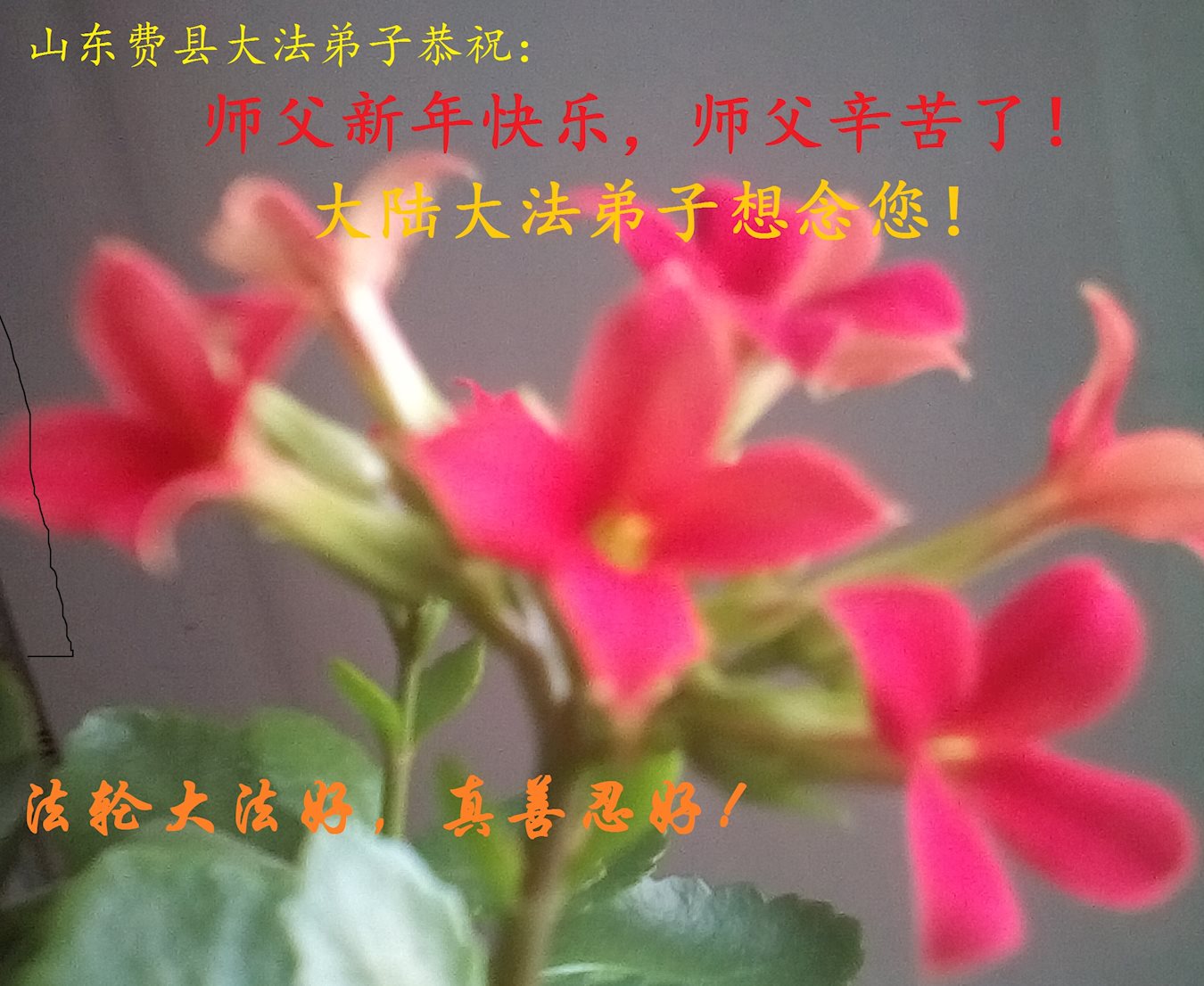 弟子們在這裏給您拜年了,在新的一年裏請師父放心,弟子們一定會聽師父的話,修好自己、不斷精進做好三件事多救人,真正的助師正法,兌現誓約。請師尊放心。