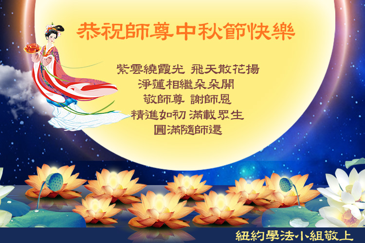 我們是美國紐約法拉盛學法小組大法弟子:恭祝慈悲偉大的師尊中秋快樂!