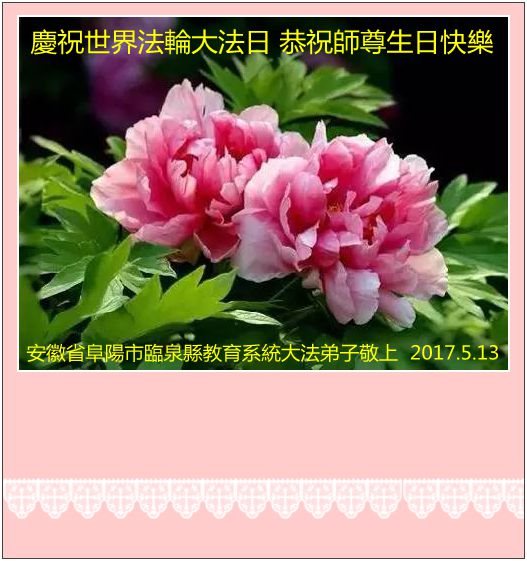 今年是法輪大法洪傳世界二十五週年,在這普天同慶、同賀的歡樂節日裏,我們懷著一顆虔誠與感恩之心,向師尊問好!師尊您好!師尊您辛苦了!您為弟子們操碎了心而我們卻無以回報!唯一能做到的就是:百分之百的信師信法,多學法,做好弟子們該做的三件事,遇事無條件的向內找,修好自己。