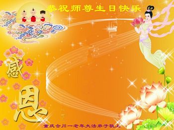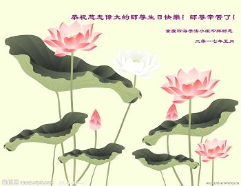 全世界大法弟子同慶法輪大法日之際,敬祝慈悲偉大的師尊生日快樂!衷心感謝師尊的慈悲救度,用盡人間語言也無法表達對師尊的感恩,弟子唯有百分之百的信師信法,做好三件事,學好法,多救人,決不辜負師尊的期望,完成自己來前的洪願,兌現自己的誓約,圓滿隨師還!