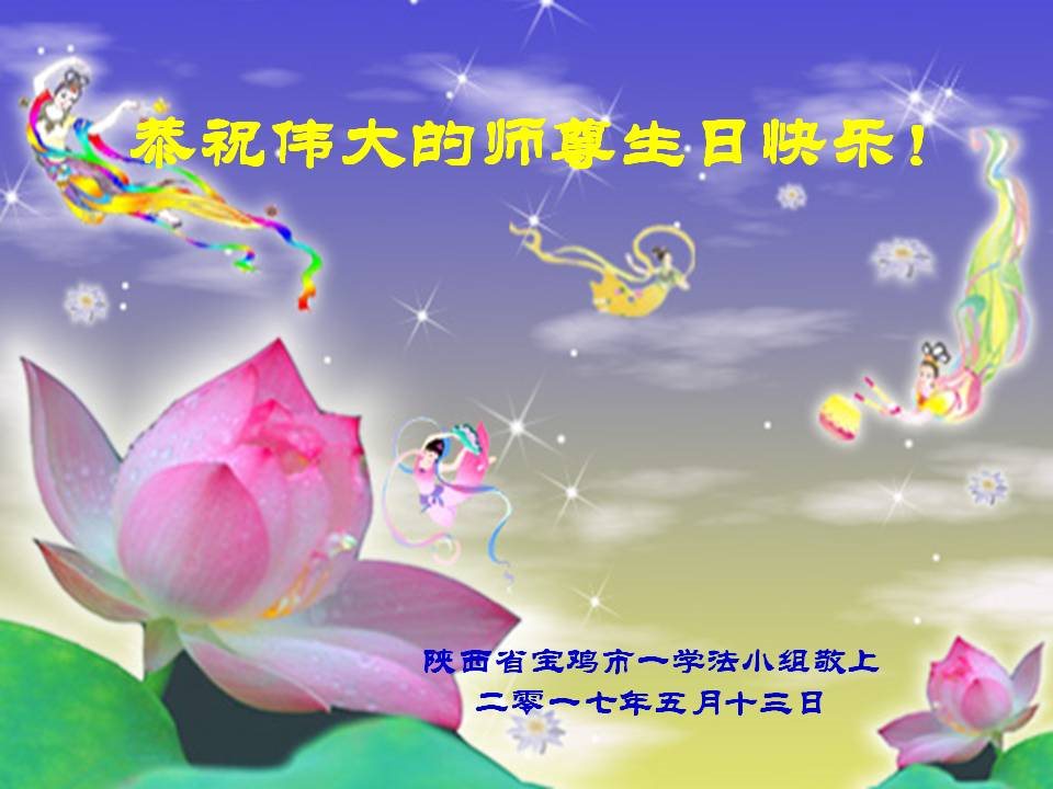 陝西寶雞市岐山縣大法弟子恭賀5﹒13世界法輪大法日!恭祝師尊生日快樂!感恩師尊慈悲救度,師尊您辛苦了!弟子們一定珍惜修煉機緣,以法為師,做好三件事,多救人,圓滿隨師返。合十!