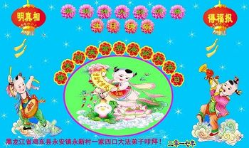 黑龍江省密山市一大法弟子全家及兩個女兒和孫子孫女共八人祝偉大的師父生日快樂!