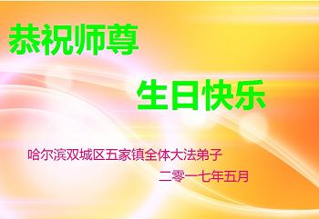 黑龍江省哈爾濱市雙城市區五家鎮大法弟子恭祝師父生日快樂!普天同慶世界法輪大法日!