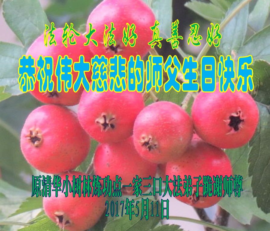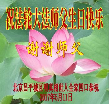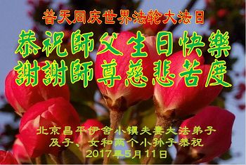 居住在北京昌平伊捨小鎮夫妻大法弟子及子、女和兩個小孫子恭祝師父生日快樂!普天同慶世界法輪大法日!謝謝師尊慈悲苦度!