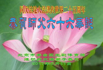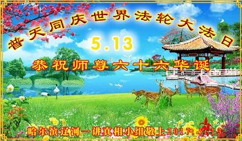 遼寧省瀋陽楊士大法弟子恭祝慈悲偉大的師尊生日快樂!慶祝世界法輪大法日!