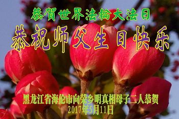 黑龍江省綏化市海倫市向榮鄉明真相母子二人恭賀世界法輪大法日!恭祝師父生日快樂!
