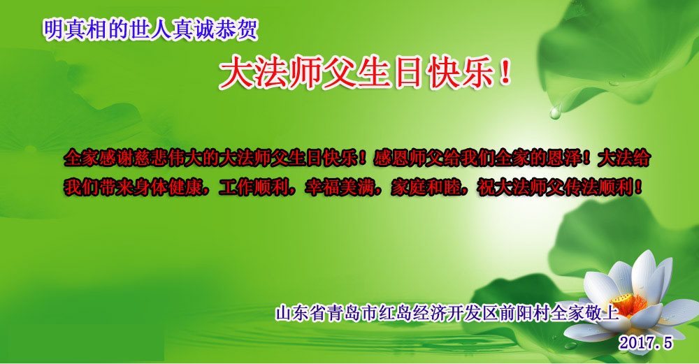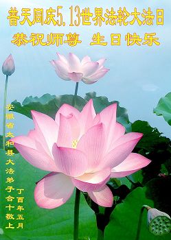 在這普天同慶的日子裏,我們恭祝慈悲偉大的師父生日快樂!感謝師父把宇宙大法傳於我們,使我們走上了回家的路。