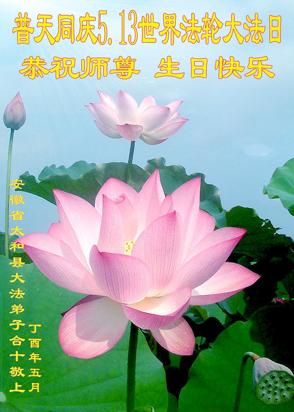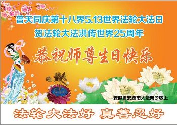 安徽省太和縣大法弟子恭祝師尊生日快樂!感謝師父的慈悲苦度!同賀法輪大法洪傳二十五週年!