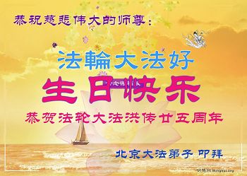 北京大法弟子恭祝師尊生日快樂!恭賀世界法輪大法日,恭賀法輪大法洪傳25週年,普天同慶。