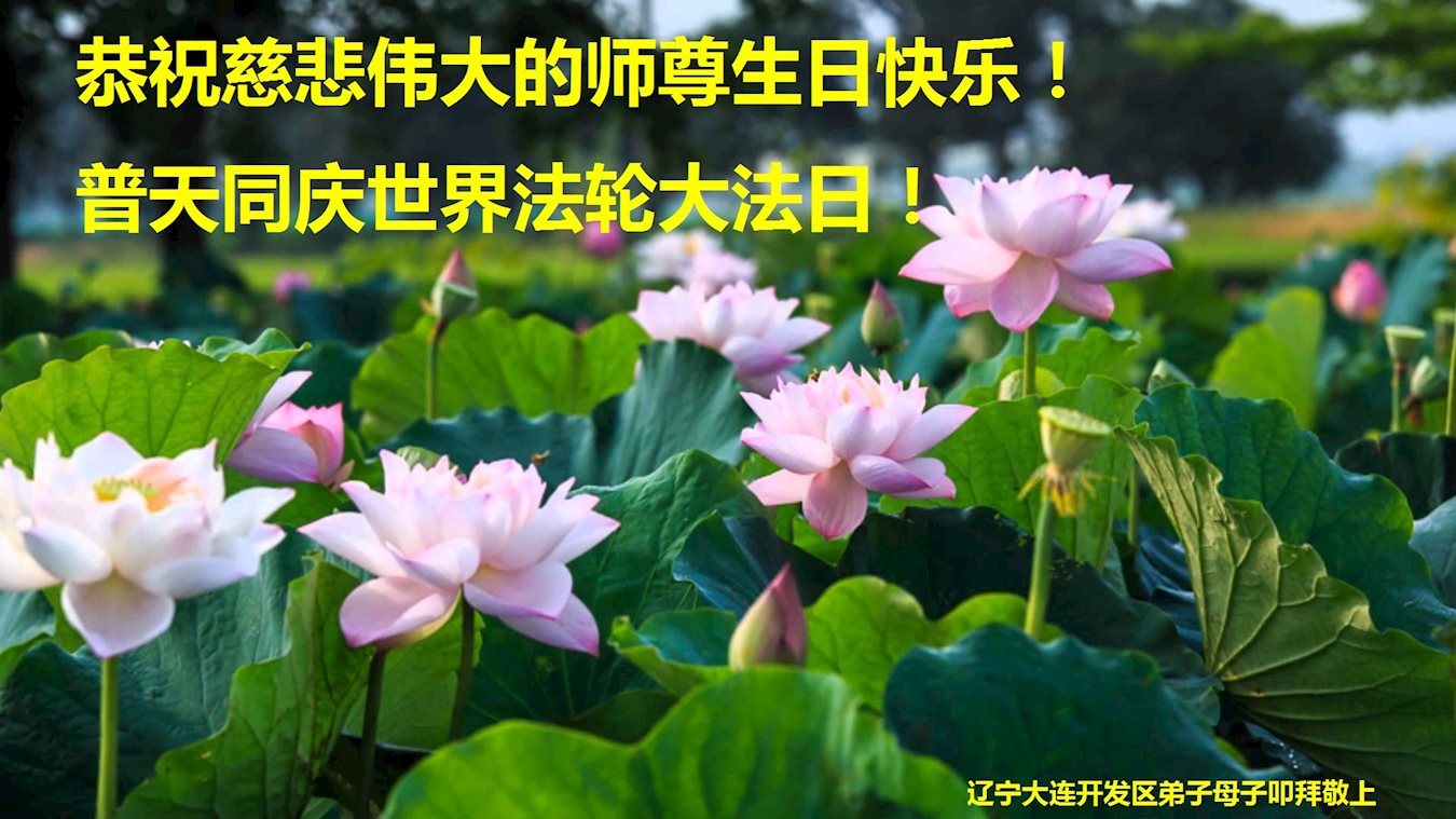 遼寧大連開發區弟子母子攜全家恭祝師尊生日快樂!恭賀世界法輪大法日!