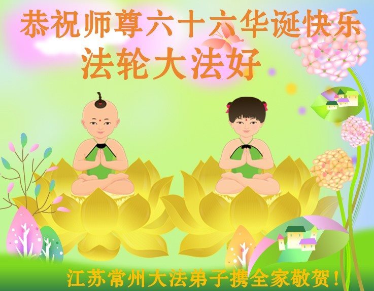 江蘇常州大法弟子攜全家恭祝師尊六十六華誕快樂!法輪大法好!